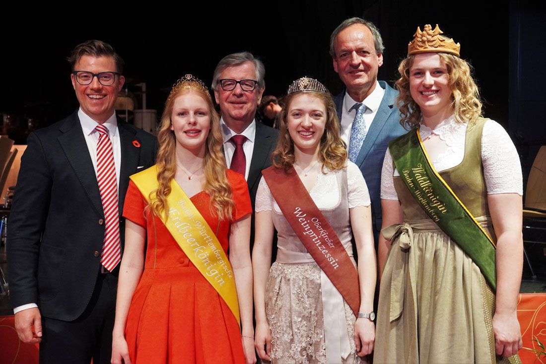 Oberbürgermeister Gregor Bühler (links) mit Oberbürgermeister a.D. Matthias Braun (2.v.r.) und dem ehemaligen Bürgermeister Willi Stächele MdL (Mitte) sowie den Wein-, Erdbeer- und Waldhoheiten (v.l.n.r.) beim Festakt zum 700-jährigen Jubiläum der Stadtrechte in der Erwin-Braun-Halle.