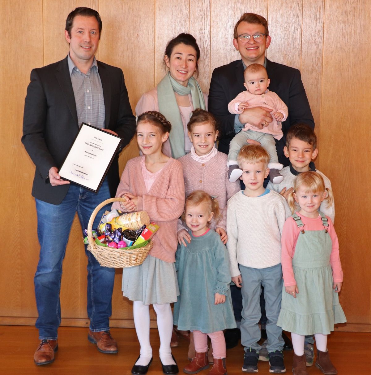 Eine ganz besondere Urkunde durfte Appenweiers Bürgermeister Manuel Tabor letzte Woche an Viktoria und Dietrich Dobjanski aushändigen. Die kleine Maria (geb. im Juli 2022) ist nämlich das siebte Kind der jungen Familie aus Appenweier.