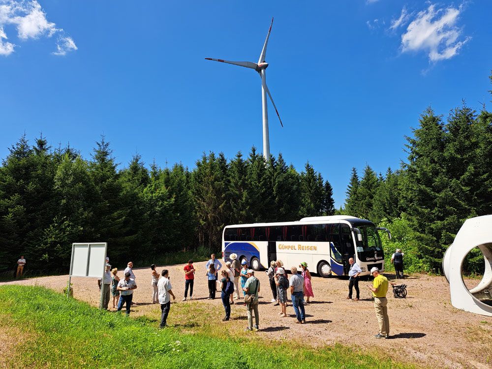 Besichtigt wurde eine der größten solarthermischen Anlagen der Region. Die 2020 errichtete Anlage der Fernwärme Ettenheim GmbH versorgt zusammen mit einer Holzhackschnitzelheizung die Heimschule St. Landolin und rund 200 Haushalte nahezu CO₂-neutral mit Wärme. Die Fläche wird ökologisch aufgewertet – unter anderem durch eine Magerwiese, Schafhaltung und regionale Bepflanzung. Im Windpark Langenhard bei Lahr und Seelbach wurden drei Windenergieanlagen besichtigt. Zwei der Anlagen wurden im Zuge von Repowering-Maßnahmen durch leistungsstärkere Modelle ersetzt und erzeugen heute drei- bis viermal so viel Strom wie ihre Vorgänger. Die dritte Anlage soll 2025/26 durch eine moderne 6-Megawatt-Anlage ersetzt werden. Der Windpark steht exemplarisch für die technologische Weiterentwicklung der Windenergie und die erfolgreiche Einbindung von Bürgerinnen und Bürgern in die Energiewende. Die Exkursion endete mit der Vorstellung eines Kooperationsprojekts in Elgersweier. Die 2024 gegründete Genossenschaft „Bürger Energie Ortenau eG“ realisiert ein innovatives Projekt zur Doppelnutzung von Flächen: Entlang der B33 in Elgersweier werden auf einer Lärmschutzwand rund 700 Solarmodule installiert. Die Anlage mit 290 kWp Leistung soll jährlich etwa 300 MWh Strom erzeugen – genug für rund 100 Haushalte. Ermöglicht wird das Projekt durch Bürgerbeteiligung, regionale Partner und eine Förderung des Landes Baden-Württemberg.