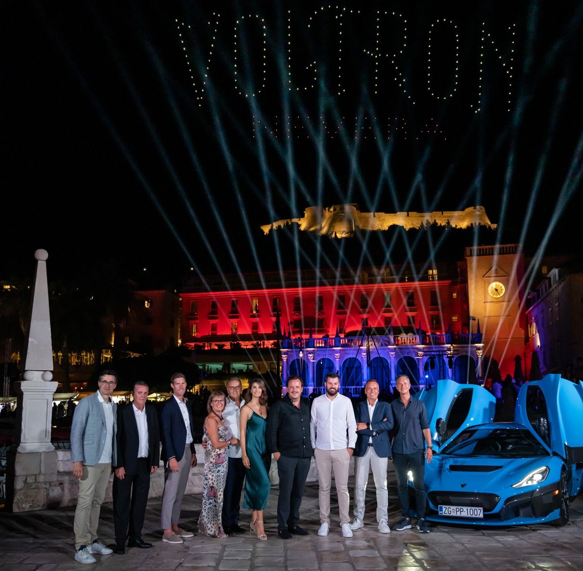 Ivan Sablic (Kroatischer Generalkonsul in Stuttgart), Rikardo Novak (Bürgermeister Hvar), Nicolas Mack, Marianne Mack, Roland Mack, Miriam Mack, Michael Mack, Mate Rimac, Hendrik Malinowski (Managing Director von Bugatti), Lutz Meschke (stellv. Vorstandsvorsitzender Porsche AG) bei der Verkündung des Namens der neuen Achterbahn Voltron Nevera