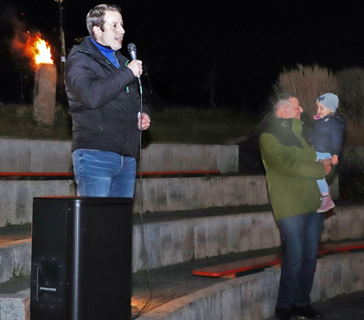 Acherns OB Manuel Tabor (am Mikrofon) und Bürgermeister-Stellvertreter Wendelin Huschle mit Tabors Tochter Marie