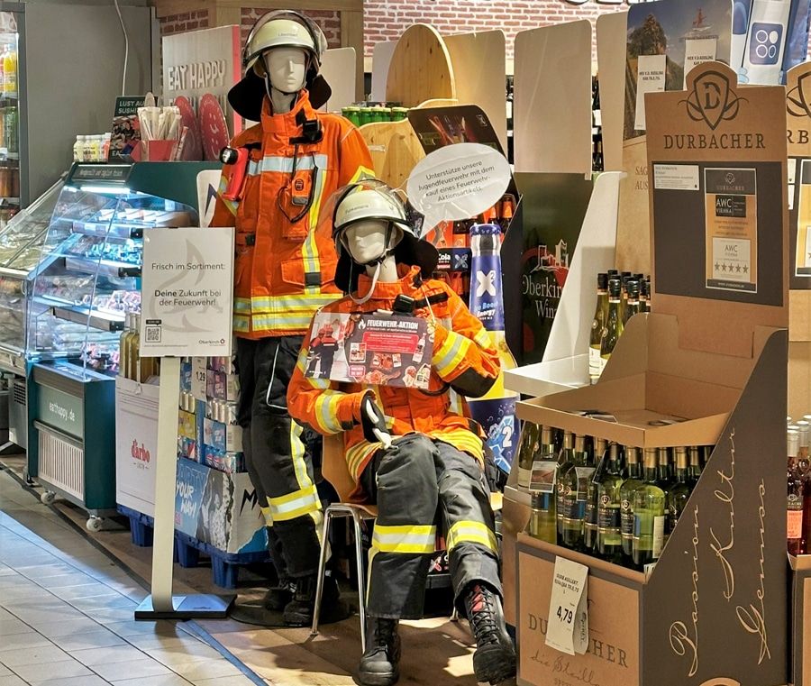 Bereits an drei Standorten in der Stadt waren die beiden Puppen im Einsatz. Ziel ist es, das Engagement bei der Feuerwehr stärker ins öffentliche Bewusstsein zu rücken und neue Mitglieder zu gewinnen. Im EDEKA-Markt ist die Aktion mit einem besonderen Aktionssortiment verbunden: Wer bis Ende September zur Feuerwehr-Wurst, Feuerwehr-Bockwurst, dem Feuerwehr-Steak, den Feuerwehr-Ciabatta-Brötchen oder dem Schwarzwald-Sprudel greift, unterstützt mit seinem Einkauf direkt die Jugendfeuerwehren im Südwesten. Ein Teil des Erlöses aus dem Verkauf dieser Produkte wird von EDEKA an die Landesverbände der Feuerwehren im Südwesten zur Förderung der Jugendfeuerwehren gespendet.