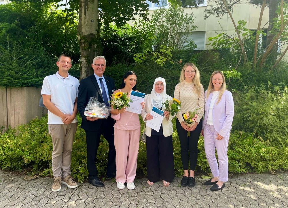Freuen sich über den erfolgreichen Abschluss: (v.l.) Robert Püschel, Bereichsleiter Pflege am Ortenau Klinikum in Kehl, Dr. Peter Kraemer, Medizinscher Vorstand, Absolventinnen Samira Müller und Naouel Boughachiche, Kimberly Bilger, Assistentin des Medizinischen Vorstands, sowie Kathleen Messer, Pflegerische Vorständin.