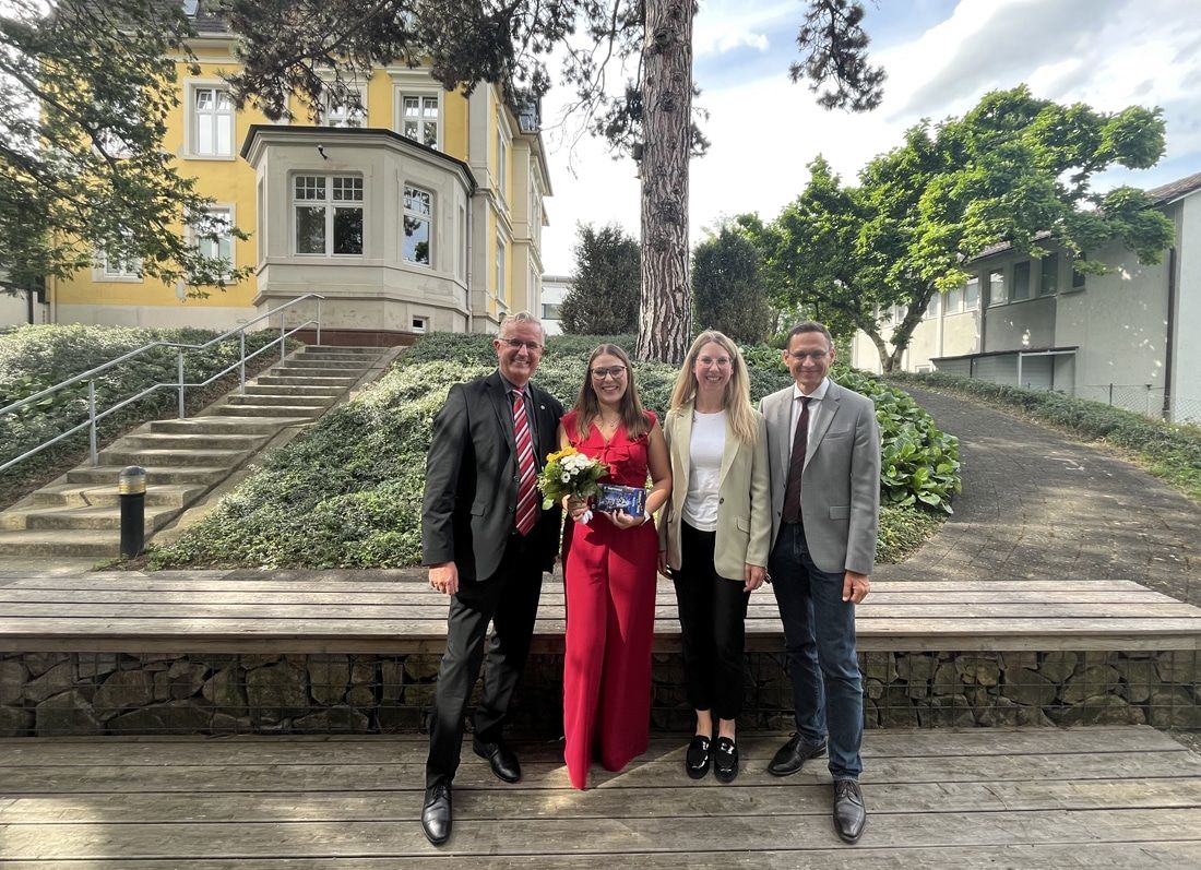 Auszeichnung für den Besten Abschluss: (v.l) Dr. Peter Kraemer, Medizinischer Vorstand, beste Absolventin Janina Seiter, Kimberly Bilger, Assistentin des Medizinischen Vorstands, und Ralf Schneider, Schulleiter der beruflichen Schulen Achern.