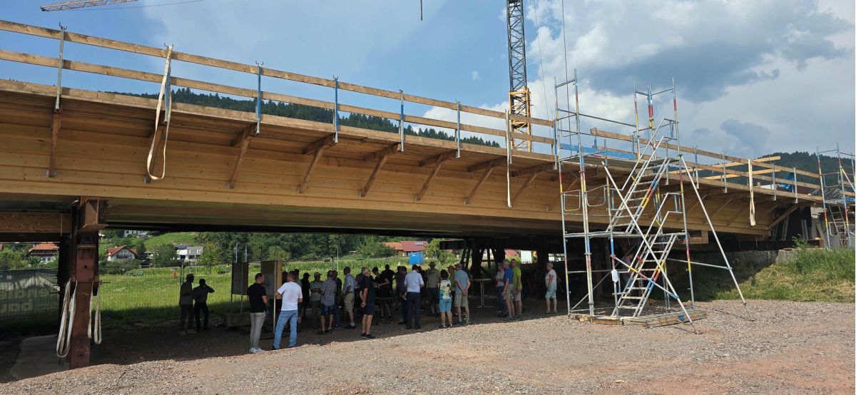 Offenburg/Haslach, 18. August 2025 – Rund 150 Bürgerinnen und Bürger nutzten am vergangenen Freitag die Gelegenheit, sich direkt vor Ort ein Bild von der Baustelle der neuen Verbindungsbrücke zwischen Fischerbach und Haslach zu machen. Bei bestem Sommerwetter stellte der Ortenaukreis sein Pilotprojekt in Holz-Beton-Verbundbauweise vor, das im Frühjahr 2026 fertiggestellt sein soll.