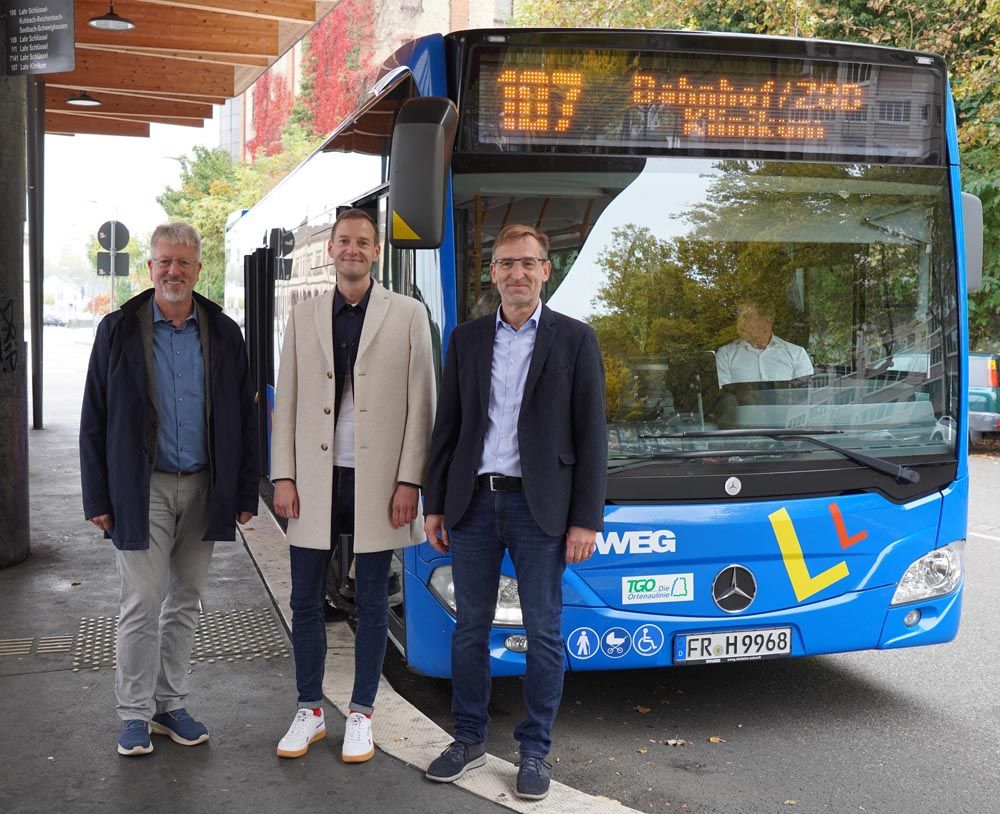 Bürgermeister Tilman Petters, Verkehrsplaner Martin Stehr und Wolfgang Bumann, Bus-Regionalleiter West bei der SWEG (von links) stellen das erweiterte Angebot der Buslinie 107 in Lahr vor.