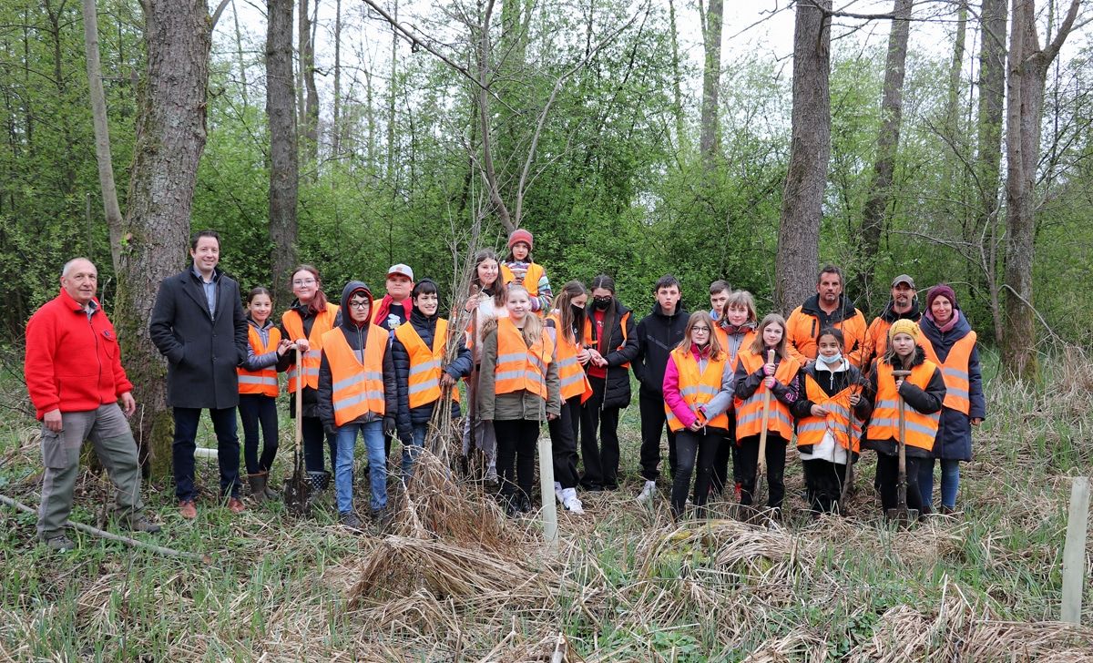 Bei wenig frühlingshaftem Wetter ging es mit Regenkleidung und Spaten ausgerüstet in den Wald nahe der B28. Unter fachkundiger Anleitung von Gemeindeförster Hubert Huber setzten die Kinder dort etwa 150 junge Stieleichen und Hainbuchen und statteten die Jungpflanzen auch gleich mit Verbissschutz aus.