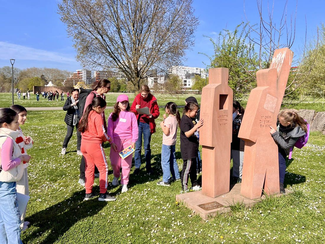 Am dritten Projekttag Ende März trafen sich die Viertklässler beider Länder an der Passerelle in Straßburg. „Wie funktioniert denn diese Karte?“ – „Où peut-on trouver ces chiffres?“ – Ein Orientierungslauf durch den „Jardin des Deux Rives“, sprich durch den „Garten der zwei Ufer“ in Straßburg ist im Sprachgewirr gar nicht so einfach! Patricia von der Eichendorff-Schule Offenburg hält in Gruppe 1 die Suchbilder in der Hand und läuft zielsicher voraus. Zusätzlich erhielten die insgesamt acht deutsch-französisch gemischten Teams eine Wegekarte mit Richtungsangaben sowie einen Aufgabenzettel, der an jeder der Stationen zu lösen war. So lautete zum Beispiel eine Frage: „Wofür stehen die Figuren am Rheinufer?“ – Auf den Steinfiguren sind in beiden Sprachen die Worte „Ich gebe, Du gibst… Sie leben“ eingemeißelt. Ihre Antwort durften die französischen und deutschen Kinder jeweils in ihrer Sprache aufschreiben. „L’amour, l’amitié“ – „Liebe, Freundschaft“, notierte Meyssem, Grundschülerin aus Illkirch-Graffenstaden.