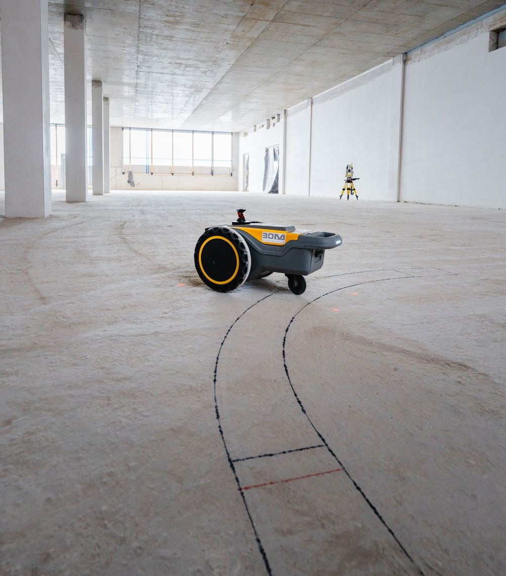 Der Druckroboter erinnert optisch an einen kleinen, selbstfahrenden Staubsauger. Mit seinen drei Rädern, einem integrierten Tracking-Prisma und einer Druckdüse an der Unterseite druckt er mithilfe verschiedener Tinten auf Untergründe wie Beton, Asphalt, Holz oder sogar Vinyl und Epoxidharz. Selbst unebene, staubige oder feuchte Böden stellen kein Hindernis dar. Über integrierte Sensoren erkennt der Roboter Hindernisse und weicht ihnen automatisch aus.