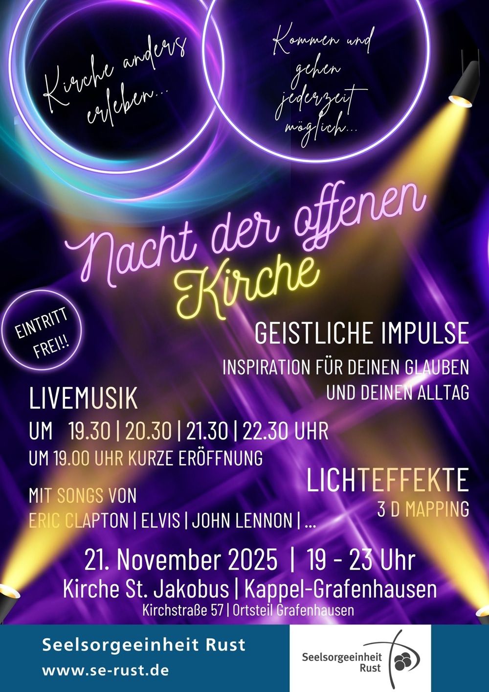 Am 21. November 2025, von 19.00 – 23.00 Uhr, bieten wir in der Kirche St. Jakobus, (Kappel-) Grafenhausen, eine Veranstaltung im Rahmen „besondere und alternative Gottesdienstformen“ an.