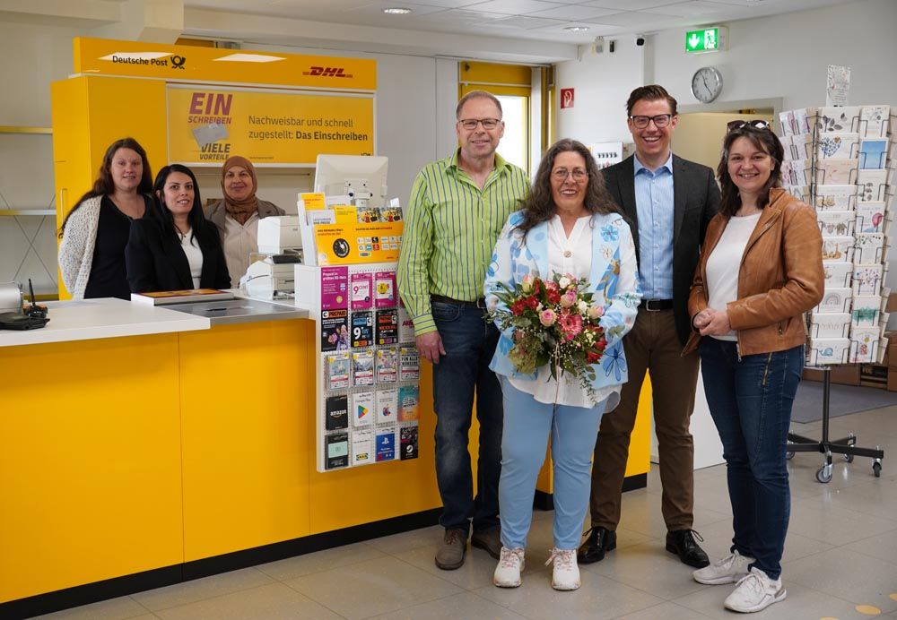 Oberbürgermeister Gregor Bühler (2.v.r.) und Wirtschaftsförderin Nadine Meier (rechts) überbrachten Pächterin Liane Schäfer (3.v.r) sowie dem gesamten Team die besten Glückwünsche zur Wiedereröffnung der Postfiliale.