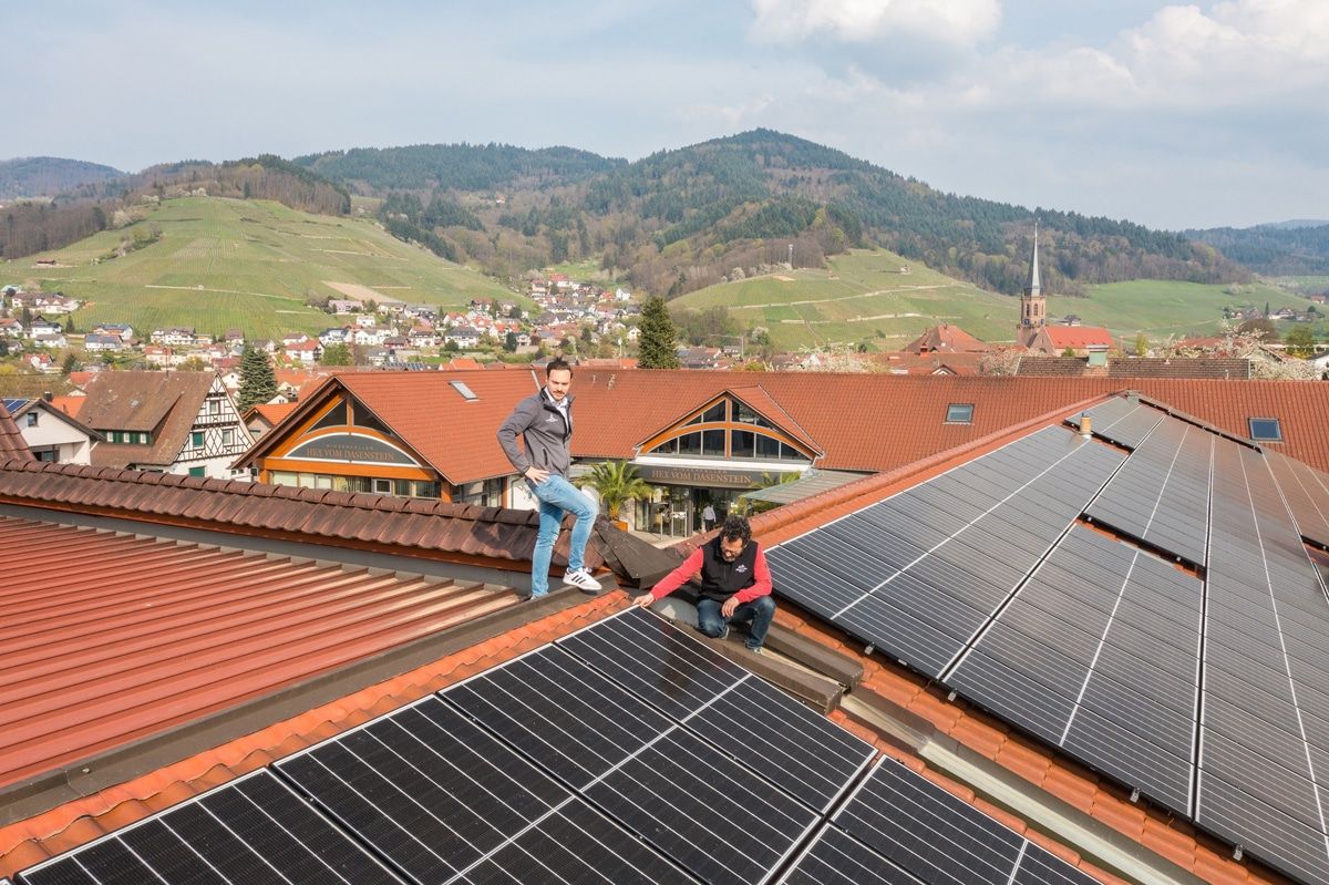 Eine neue Photovoltaik-Anlage auf dem Dach des Winzerkellers Hex vom Dasenstein liefert bis zu 100 Kilowattstunden, hier inspiziert von Sebastian Hill und Frank Männle
