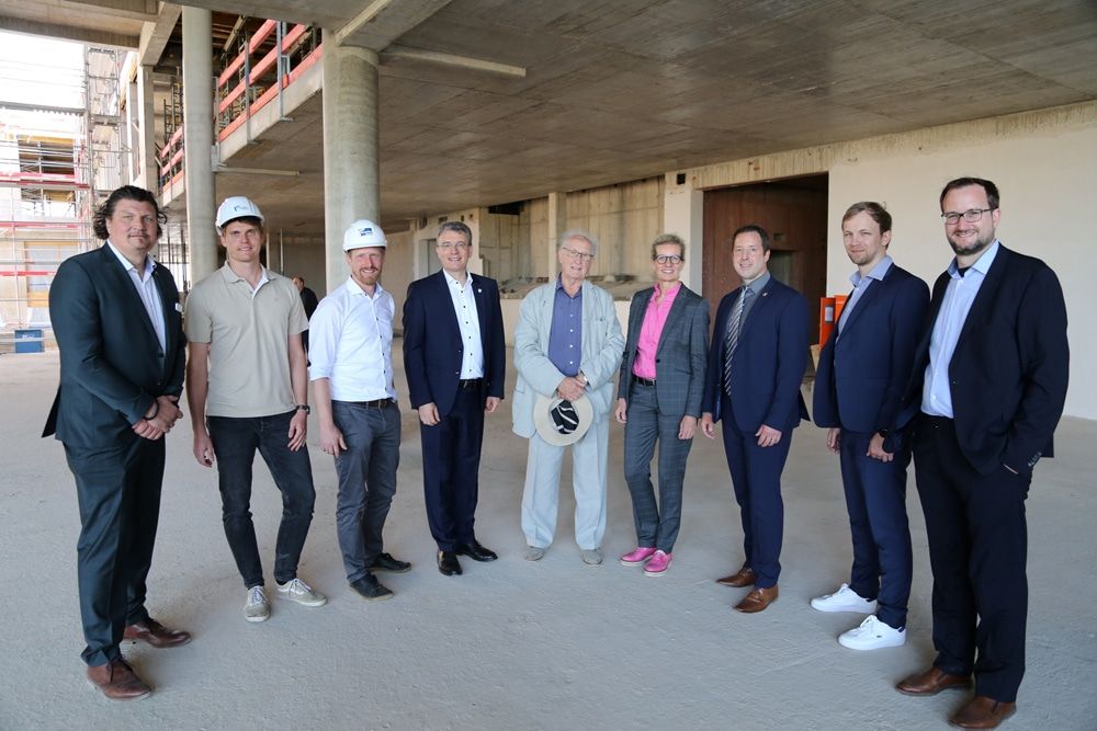 Freuen sich über den schnellen Baufortschritt und ein gelungenes Richtfest für den Klinikneubau in Achern: (v.l.) Geschäftsbereichsleiter Rainer Stapf, Bauleiter Jonas Burger und Simon Dietrich von Rendler Bau, Landrat Thorsten Erny, Architekt Professor Dr. Volkwin Marg, Vorstandsvorsitzende Claudia Bauer-Rabe, Oberbürgermeister Manuel Tabor und die Architekten Christoph Beuting und Stefan Walter von gmp Architekten GmbH