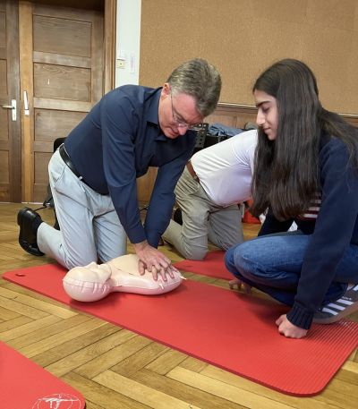 Im Mittelpunkt der Schulungen stand die Vermittlung der einfachen und lebenswichtigen Handlungsabfolge „Prüfen – Rufen – Drücken“. Professor Diehl erklärte anschaulich, dass der erste Schritt darin besteht, zu überprüfen, ob eine bewusstlose Person auf lautes Ansprechen oder Schütteln reagiert und ob sie atmet. Sollte dies nicht der Fall sein, ist es unabdingbar, sofort den Notruf zu wählen.