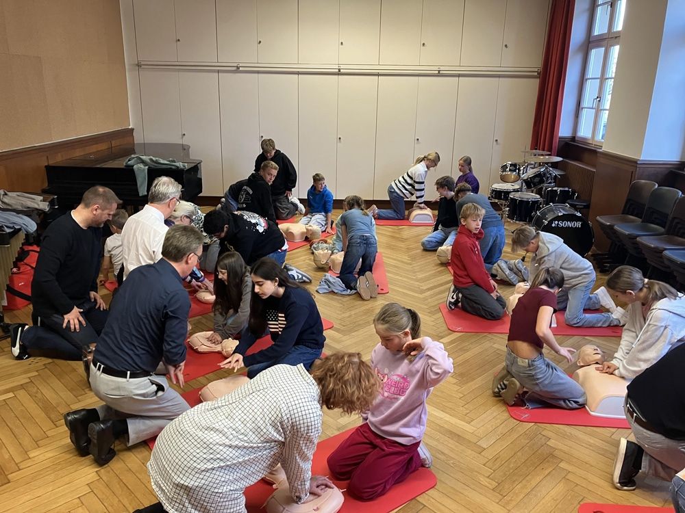 Insgesamt nahmen rund 40 Jugendliche aus den Klassenstufen 7 und 9 am Schiller-Gymnasium Offenburg und am Max-Planck-Gymnasium Lahr teil. Unter der Leitung von Professor Dr. Philipp Diehl, Chefarzt des Departments für Kardiologie, Pneumologie, Angiologie, Akutgeriatrie, Intensivmedizin und Thoraxchirurgie, sowie dem Sektionsleiter Kardiologie Dr. Fabian Meixner erhielten die Schülerinnen und Schüler eine umfassende theoretische Einführung, gefolgt von praktischen Übungen an Reanimationspuppen. Unterstützt wurden die beiden Mediziner von den Schulleitungen und den Schulsanitätern vor Ort.