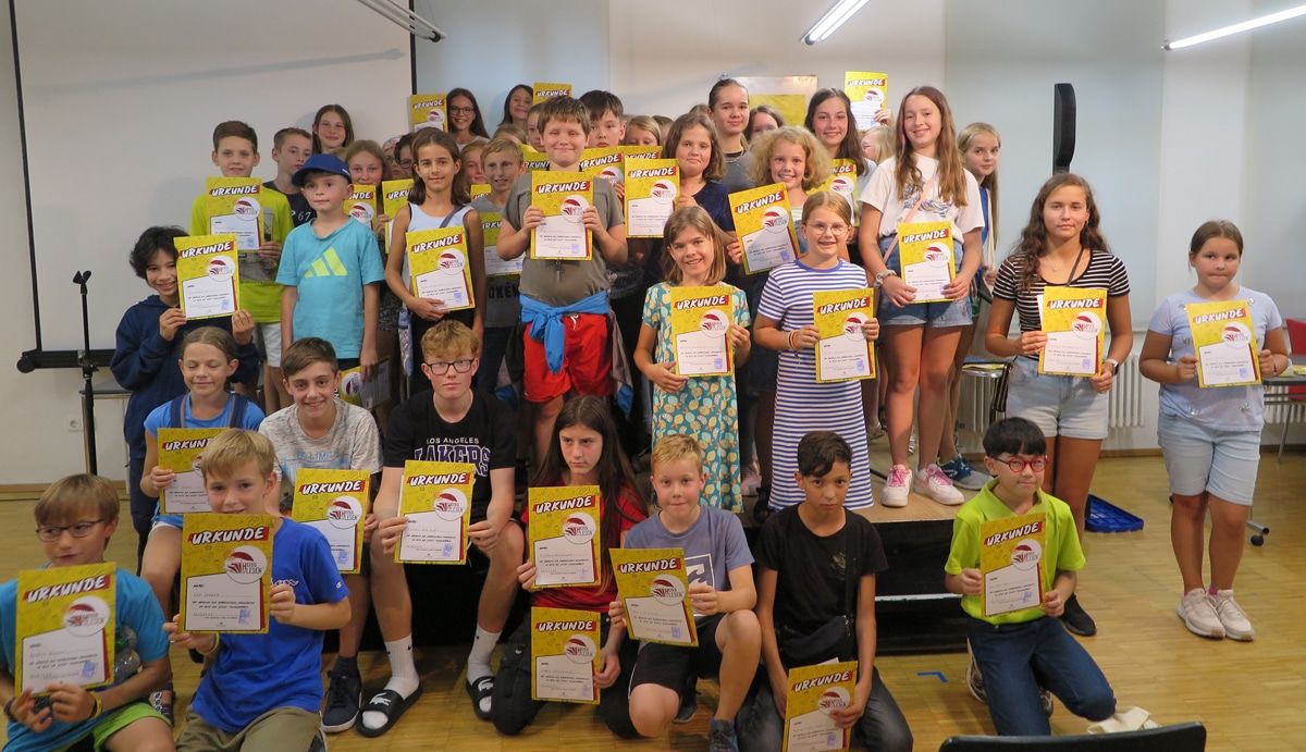Teilnehmerinnen und Teilnehmer der Aktion „HEISS AUF LESEN“ mit ihren Urkunden nach einem tollen Abschlussfest in der Stadtbibliothek Offenburg. ________________________________________