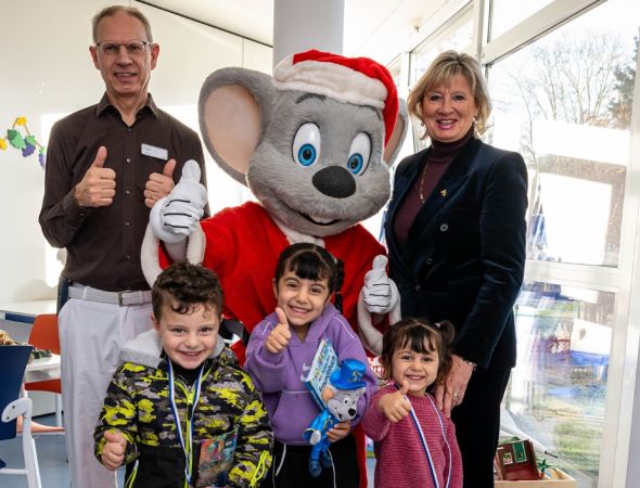 Mauritia Mack besuchte in ihrer Funktion als Schirmherrin gemeinsam mit Ed Euromaus die Kinderklinik Ortenau, um Kinder und Jugendliche in der Vorweihnachtszeit zu beschenken.
