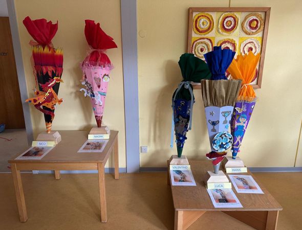 Im Kindergarten Maria Goretti in Haslach-Tiergarten sind ab sofort die individuell gestalteten Schultüten der künftigen Schulanfängerinnen und Schulanfänger im Projektraum zu sehen.