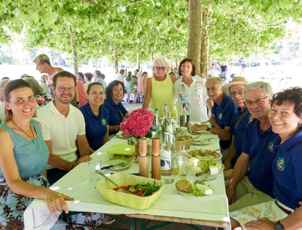 Benefiz-Picknick im Sonnenschein unter Platanen