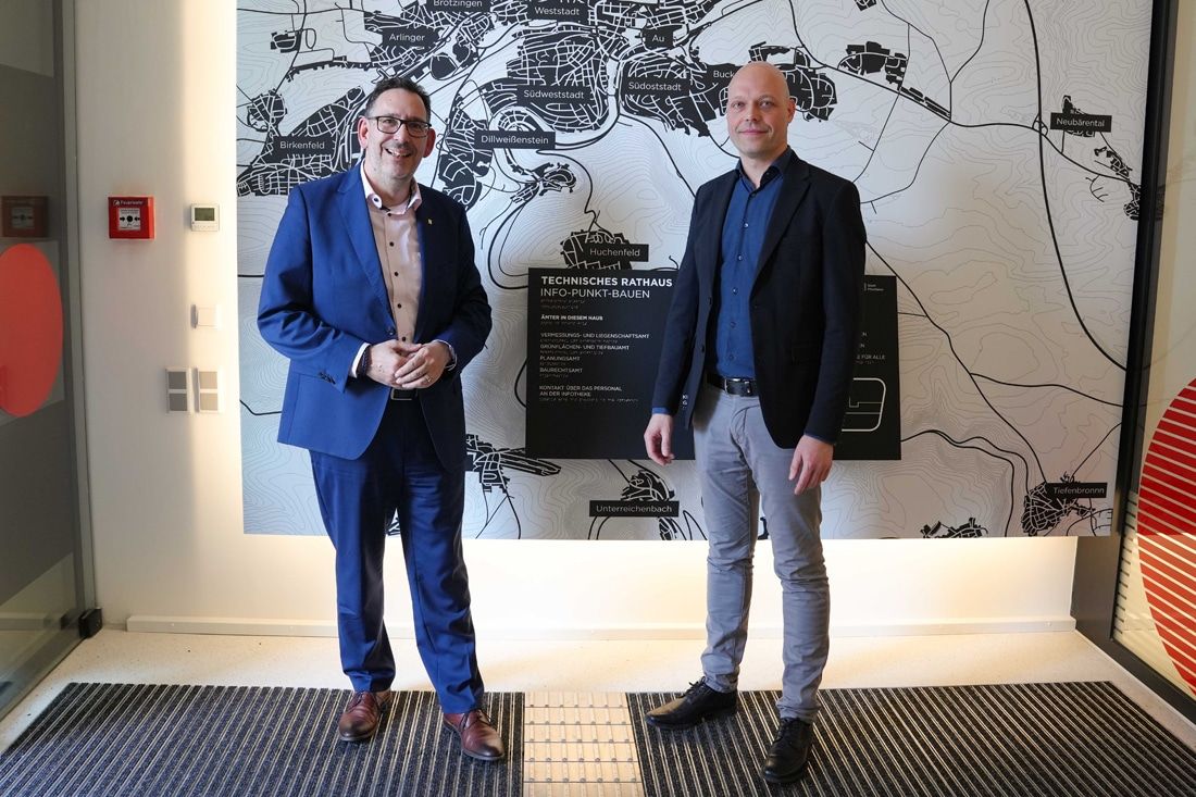 v.l.: Baubürgermeister Tobias Volle und der Amtsleiter des Baurechtsamts, Philipp Wode, dessen Amt der Infopunkt Bauen zugeordnet ist, bei der Eröffnung.