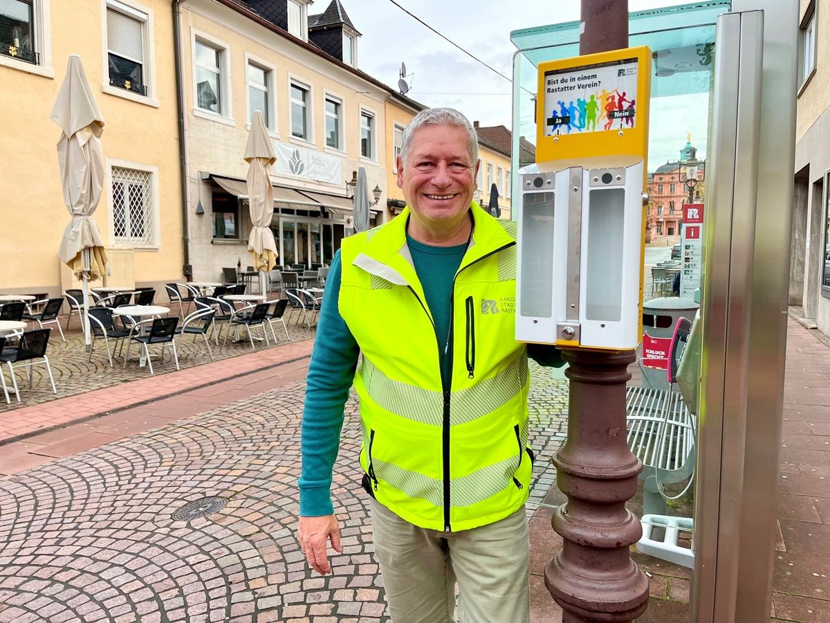 „Bist du in einem Rastatter Verein?“ Knut Zeitsmann von den Technischen Betrieben präsentiert einen der drei Abstimm-Aschenbecher, die zur sachgemäßen Entsorgung von Zigaretten animieren sollen.