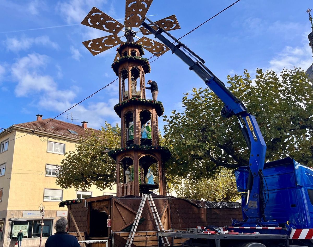 Und los geht’s mit dem Aufbau des Rastatter Weihnachtsmarktes. Den Beginn machte am Montag, 7. November, die beliebte Weihnachtspyramide.