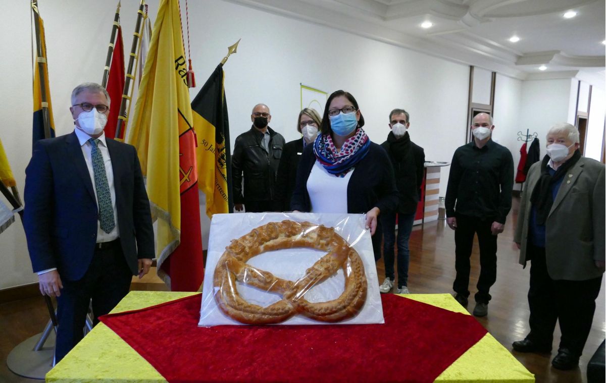 Und noch anspruchsvoller als Brot zu backen, dürfte es gewesen sein, die übergroße, aus Hefeteig gebackene und mit Röschen, Weinleitern und der Zahl 2022 verzierte Brezel herzustellen. Übernommen hat das erneut Patrick Dietsche von der gleichnamigen Rastatter Bäckerei. „Möge die Brezel uns Glück, Zufriedenheit und vor allem Gesundheit schenken“, gab Horst Ziegler, Ehrenobermeister der Bäckerinnung, die besten Wünsche für das neue Jahr mit. Knapp 40 Jahre lang war Ziegler Obermeister der Bäckerinnung Rastatt und Umgebung. Auch wenn er das Amt inzwischen an Bäckermeister Oliver Braun abgegeben hat, an der traditionellen Übergabe der Neujahrsbrezel wollen beide Bäckermeister auch künftig festhalten.