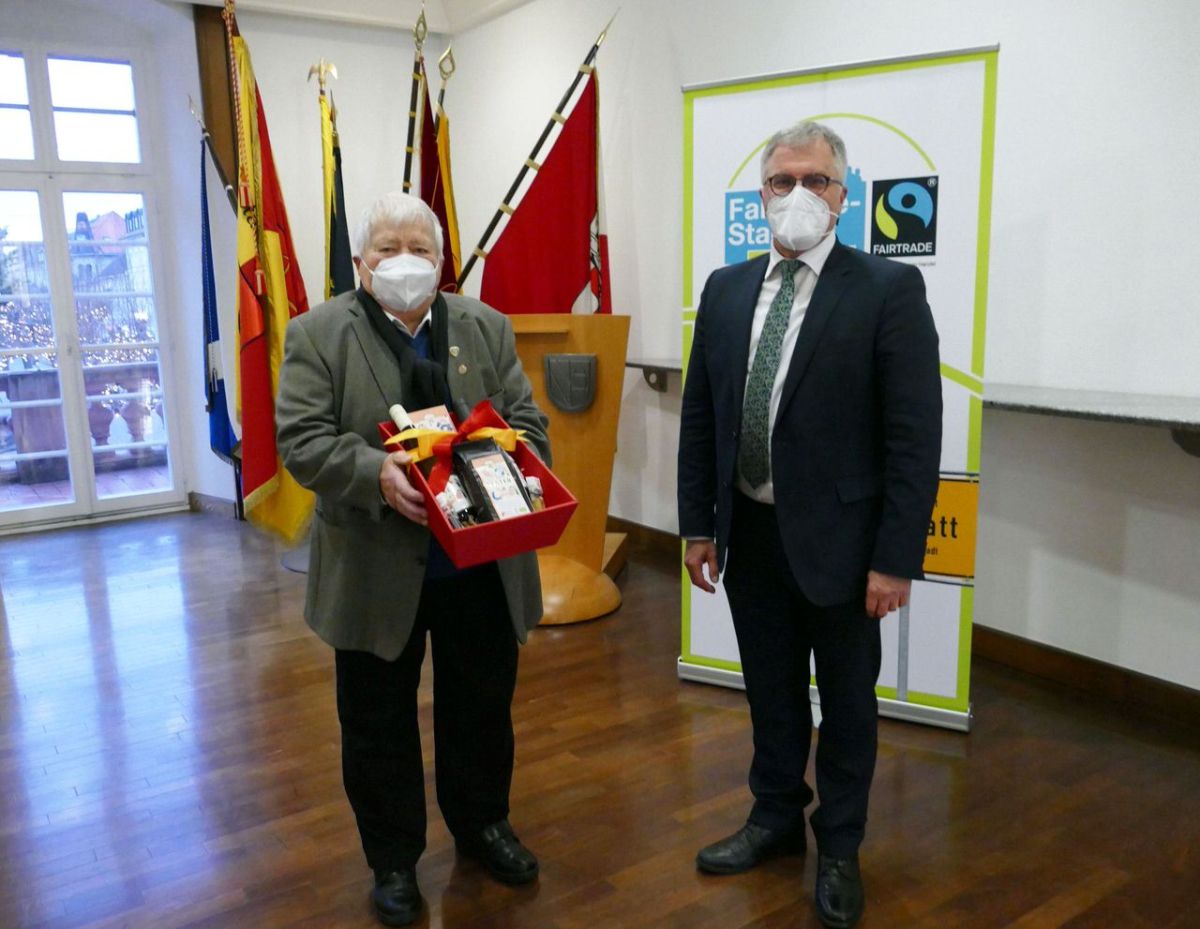 Doch nicht nur die Bäckerinnung hatte in diesem Jahr ein Präsent dabei, auch OB Pütsch nutzte die Gelegenheit, um sich bei Horst Ziegler für sein jahrelanges Engagement zu bedanken und überreichte ihm einen Geschenkkorb mit allerlei Fairtrade-Produkten aus Rastatt.