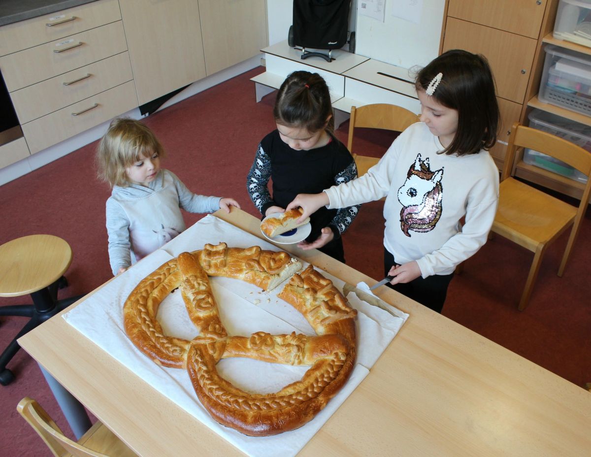 Und da sich das Glück bekanntlich verdoppelt, wenn man es teilt, reichte OB Pütsch die Neujahrsbrezel in diesem Jahr direkt an die Kinderschule Amalie Struve weiter. Simone Meister, stellvertretende Leiterin der Kinderschule, verteilte direkt am nächsten Morgen in den Gruppen den süßen Glücksbringer. „Toll, dass Herr Pütsch mit uns seine Brezel teilt“, riefen die Kinder freudig aus beim Blick auf die außergewöhnliche Leckerei zum Frühstück