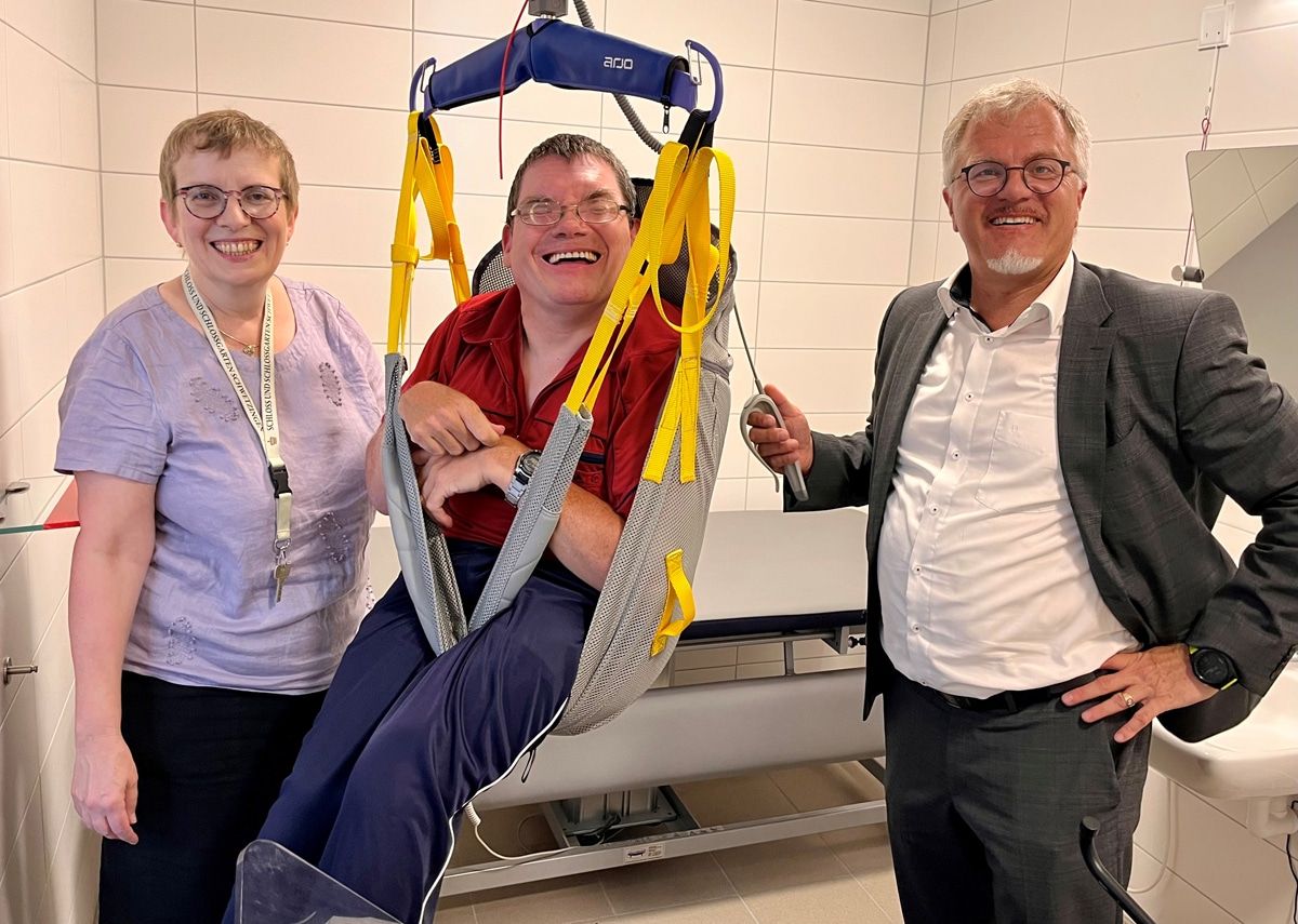 Die rund zehn Quadratmeter große, barrierefreien „Toilette für alle“ ist ausgestattet mit einer höhenverstellbaren Pflegeliege für Erwachsene, einem an der Decke befestigten Lifter fürs Umsetzen vom Rollstuhl auf die Liege sowie einem luftdichten Windeleimer. Sie ist mit dem Euro-Schlüssel rund um die Uhr zugänglich und kann auch direkt mit dem Fahrstuhl im Gebäudekomplex erreicht werden. Wie der Lifter konkret funktioniert, zeigten beim Eröffnungstermin der auf einen Rollstuhl angewiesene Patrick Thurn, unterstützt von Pagel-Steidl. Auch OB Pütsch ließ es sich nicht nehmen, beim Echttest mit dem Lifter zu assistieren. Gemeinsames Fazit: klappt!