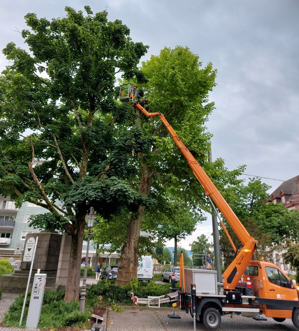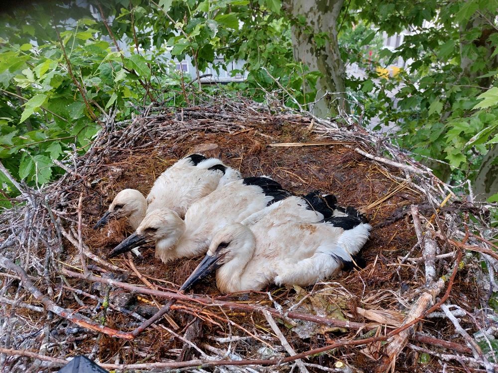 Das Storchenpaar auf dem Postplatz hat Nachwuchs bekommen. Um zu gewährleisten, dass das Nest in der Baumkrone ausreichend Stabilität hat und von den Eltern gut angeflogen werden kann, hat die Stadt am Dienstag, 3. Juni, die umgebende Platane zurückgeschnitten.