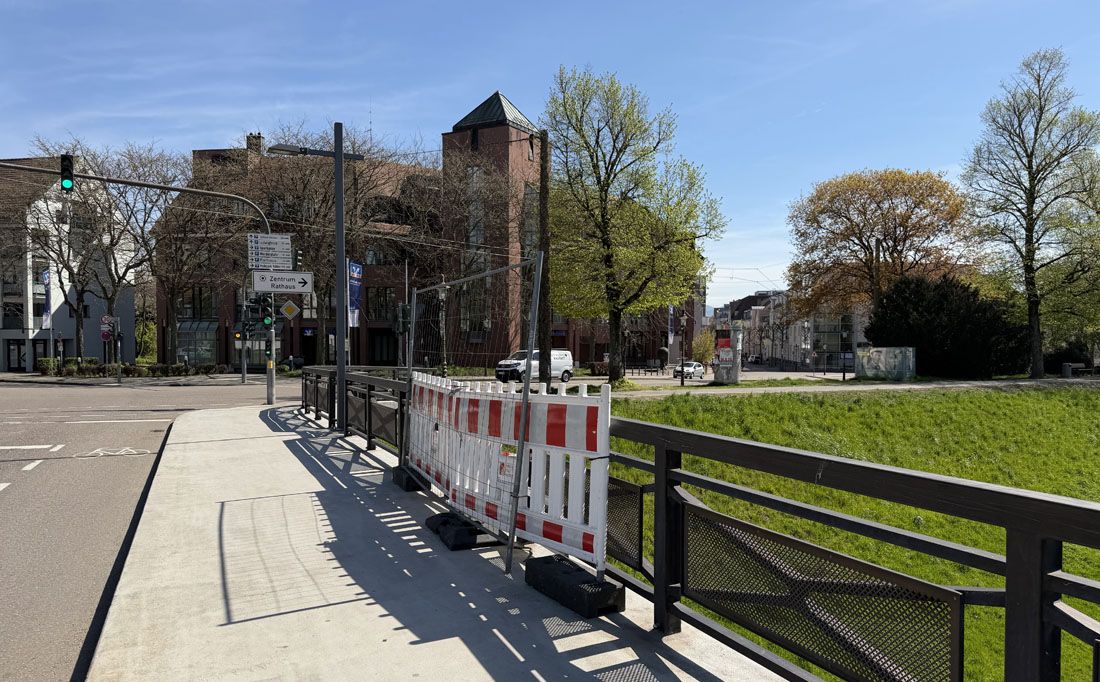 Die Sperrung betrifft die linke Seite aus Richtung der Carl-Schurz-Straße. Das alte Aluminiumgeländer wurde bei einem Unfall im letzten Jahr beschädigt und wird im Zuge der Arbeiten durch ein neues Stahlgeländer ersetzt.