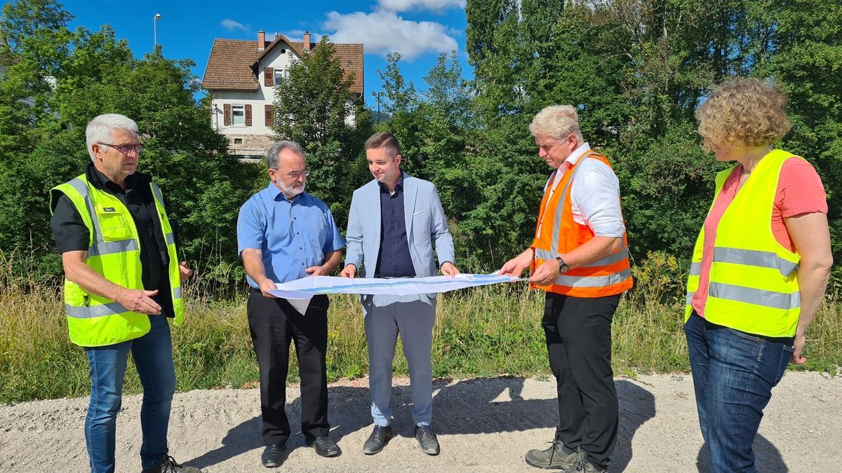 (v. l.) Dipl-Ing. Martin Hesch, Wald und Corbe Consulting, Stadtbaumeister Jürgen Zimmerlin, Bürgermeister Julian Christ sowie vom Regierungspräsidium Karlsruhe Referatsleiter Peter Schneider und Projektleiterin Silke Tänzel betrachten vor Ort den Plan zu den jetzt startenden Maßnahmen.