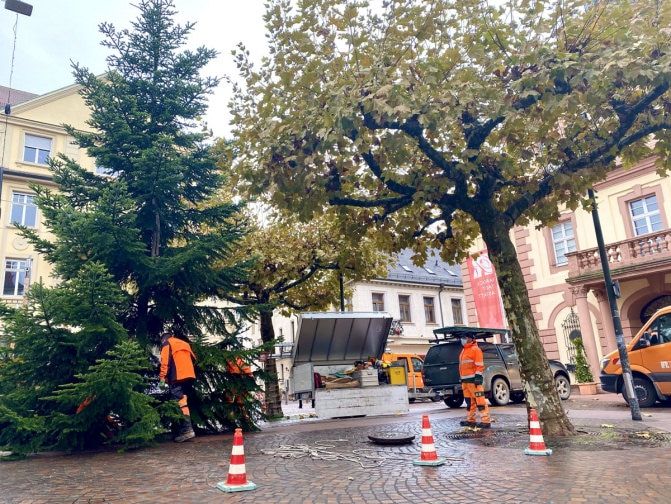 In den Morgenstunden wurde die rund elf Meter große Nordmanntanne auf dem Grundstück der diesjährigen Spender-Familie Dürr aus Rastatt gefällt und schon eine Stunde später begannen die städtischen Förster gemeinsam mit Mitarbeiter/innen des Kundenbereichs Grünflächen mit der Aufstellung des Weihnachtsbaums. Mithilfe eines Ladekrans und einer Hebebühne ging es für den Baum in die Senkrechte. Doch das gestaltete sich schwieriger als gedacht. Da der Baum zuvor neben einem Haus stand und sich dort automatisch dem Haus zuneigt, musste er nun erst einmal wieder in Form gebracht werden. Mit Keilen in der Bodenverankerung und schwerem Werkzeug gelang es den städtischen Mitarbeiter/innen schließlich, dass die Tanne nun wie eine Eins steht. In der kommenden Woche verwandelt sich die Nordmanntanne dann in einen wahren Weihnachtsbaum. Mitarbeiterinnen und Mitarbeiter der Technischen Betriebe werden zunächst die Lichterkette anbringen, ehe der Baum mit rund 1200 Kugeln in Rot und Gold geschmückt wird.