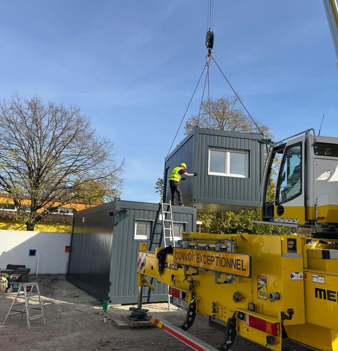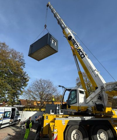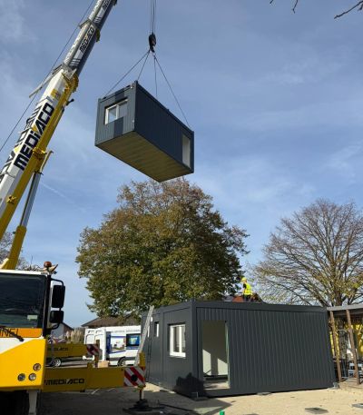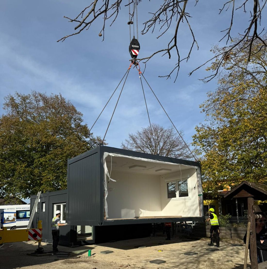Damit die Kinder weiterhin genug Bewegungs- und Spielmöglichkeiten haben, wird der Kindergarten um eine Containeranlage auf dem Parkplatz erweitert. Diese wurde bereits geliefert und bietet nicht nur 50 Quadratmeter Bewegungsfläche, sondern auch Sanitäranlagen und einen Flur. Beheizt wird der Anbau mit Infrarot-Paneelen.
