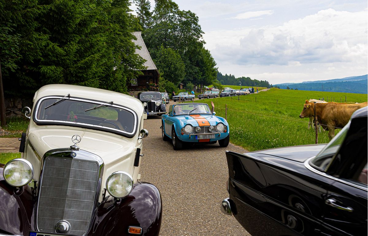 Die Rankmühle in Sankt Märgen diente als perfekter Startpunkt für die 45 Kilometer lange Schwarzwald-Rundstrecke. Sepp Saier, Initiator der Rankmühlen-Restaurierung, hatte für die Oldtimer-Freunde zuvor ein zweites Frühstück in der Mühlenküche organisiert und führte die Gäste mit interessanten historischen Erläuterungen durch das alte Gemäuer. Anschließend gab es Fahrvergnügen pur: Die Serpentinen der Spirzenstrecke hoch, über die Passhöhe Thurner zum Titisee, durch das wildromantische, mystische Mühlental Hexenloch und vorbei an der ehemaligen Glasmacher-Siedlung Glashütte schlängelte sich die Karawane der Klassiker durch den Hochschwarzwald.