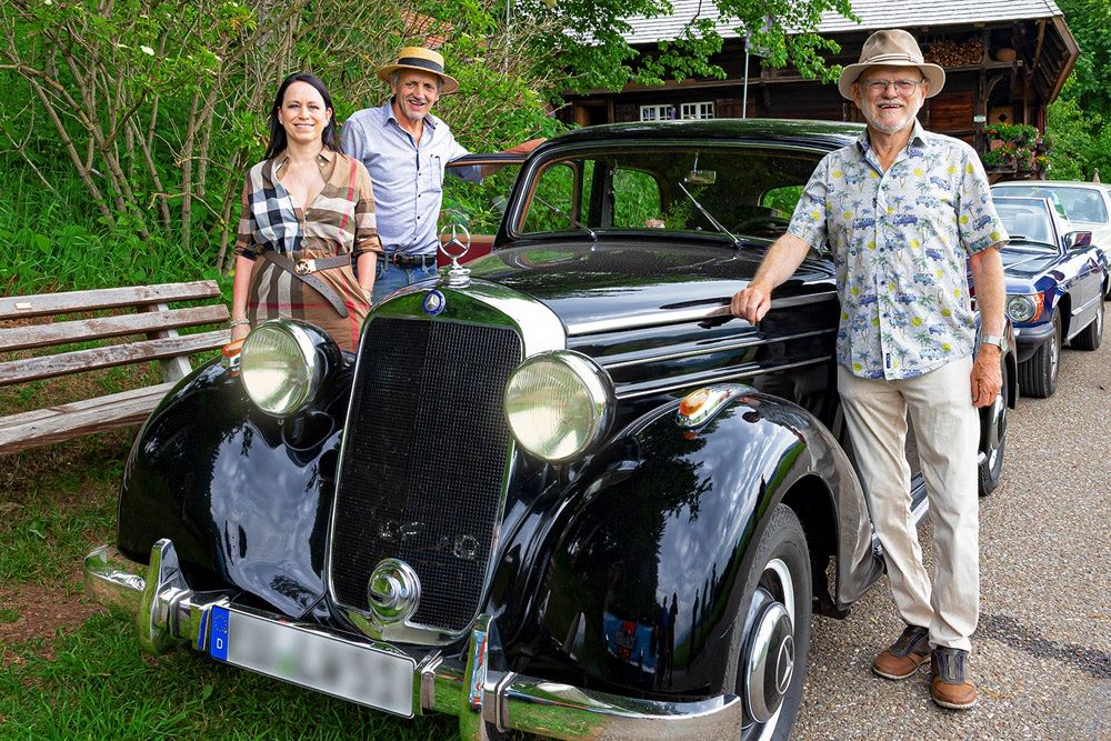 Elke Maria Pfaff, Vorsitzende der Interessengemeinschaft „Badische Oldtimer Freunde“ mit Rankmühlen-Initiator Sepp Saier (Mitte) und Mercedes-Benz-Eigner Ludwig Willmann aus Titisee-Neustadt.