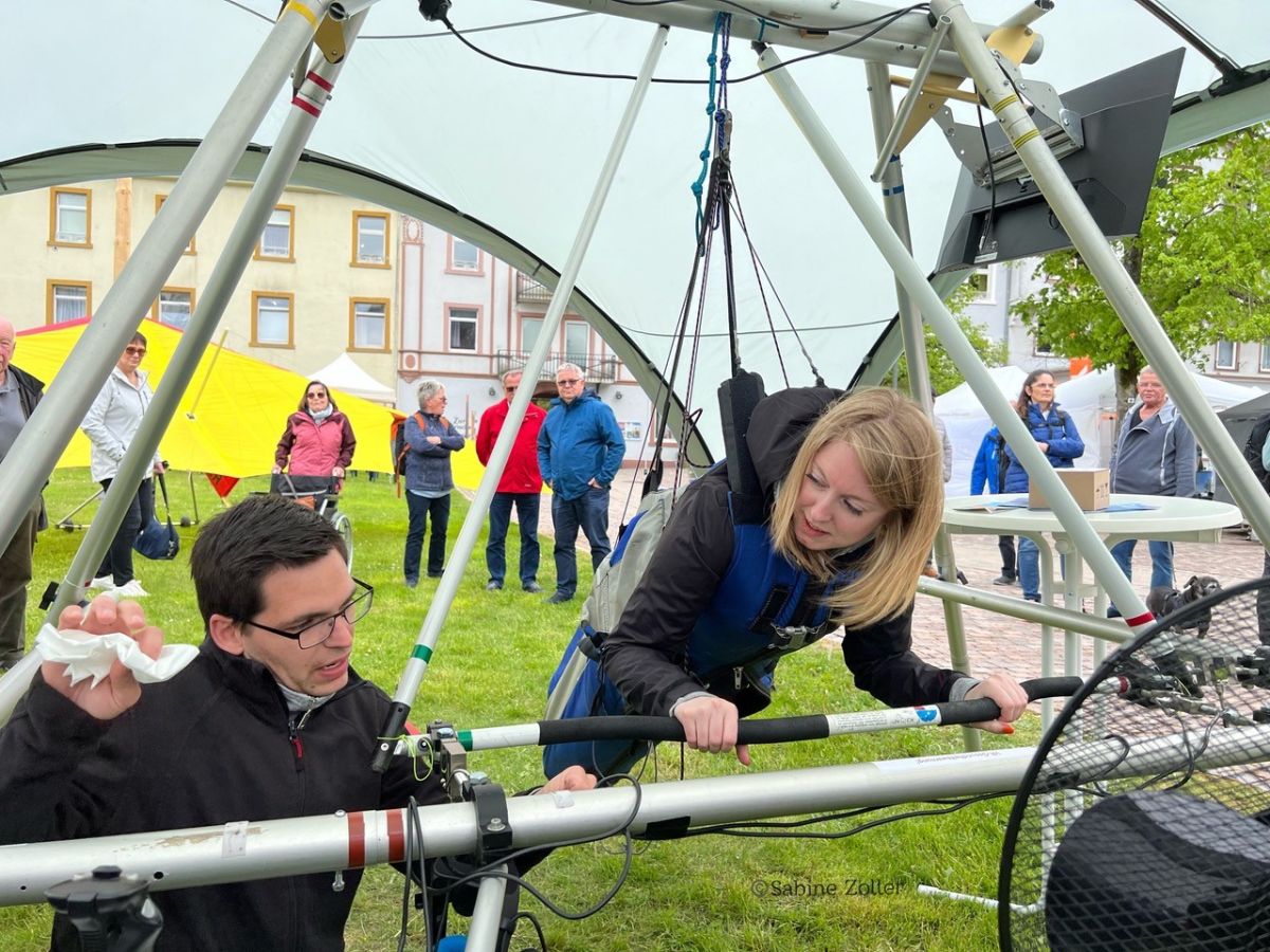 Mit mehr als zehn Ausstellern waren Touristiker aus den Gemeinden Bad Herrenalb, Dobel, Durlach, Ettlingen, Lützenhardt, Sasbach, Freudenstadt und Bad Liebenzell ebenso vor Ort, wie der Schwarzwald Verein und die Althofdrachen, die mit einem Simulator jung und alt in die Welt des Drachenfliegens entführten. Wer wollte, konnte in den Flugsack steigen und mittels VR-Brille an einem Gestell hängend die Welt aus der Vogelperspektive genießen. „Die acht Minuten sind ganz schön anstrengend“, lacht eine begeisterte Julia Strickfaden von der Albtal Plus Tourismus GmbH, die sich erstmals in ein solches Abenteuer gestürzt hat um einen Drachenflug zu erleben.