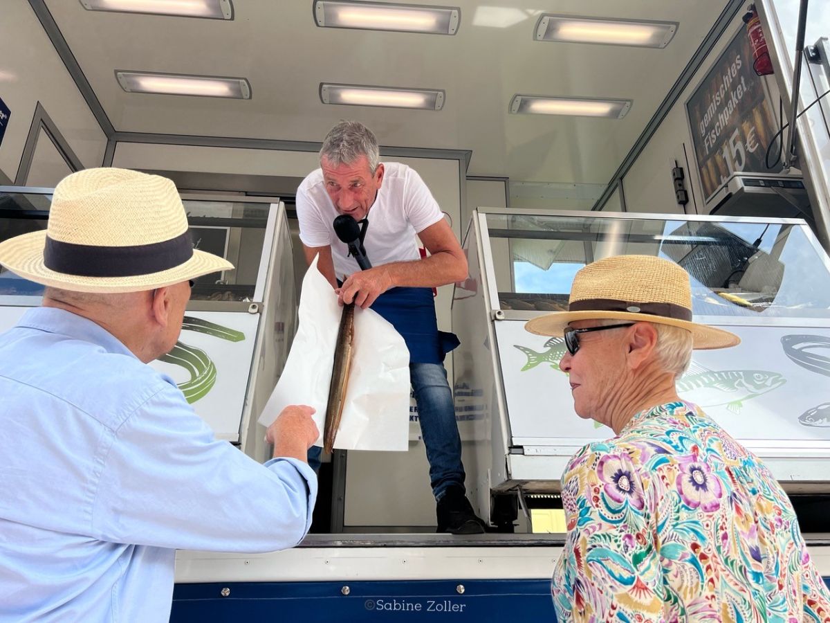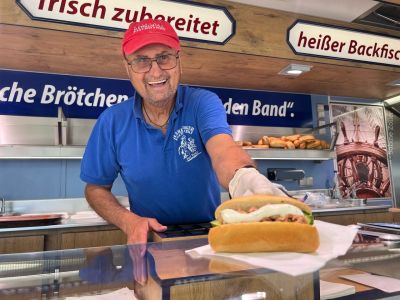 „Fischmakt-Feeling gab´s auf dem Rathausplatz noch nie“, bemerkt Ursula Krämer aus Bad Herrenalb. Die 90-jährige Rentnerin muss es ja wissen, denn sie hatte einst direkt am Rathaus das erste Herrenalber Reisebüro. „Wir müssen nicht verreisen, denn leckeres Essen gibt es auch hier“, schmunzelt ein Mann am Getränketresen und bestellt zum Backfisch im Brötchen ein Bier. Gleich nebenan bietet „Käthe Kabeljau“ Fischbrötchen in großer Auswahl daneben die holländischen Frietjes die beliebten Pommes aus dem Nachbarland oder scharfe Grillierst und Steak im Brötchen vom großen Grill neben dem Tourismusbüro der Stadt - und so bleibt bei vielen Gästen zu Hause die Küche kalt, um köstliches am Herrenalber Fischmarkt zu verzehren.