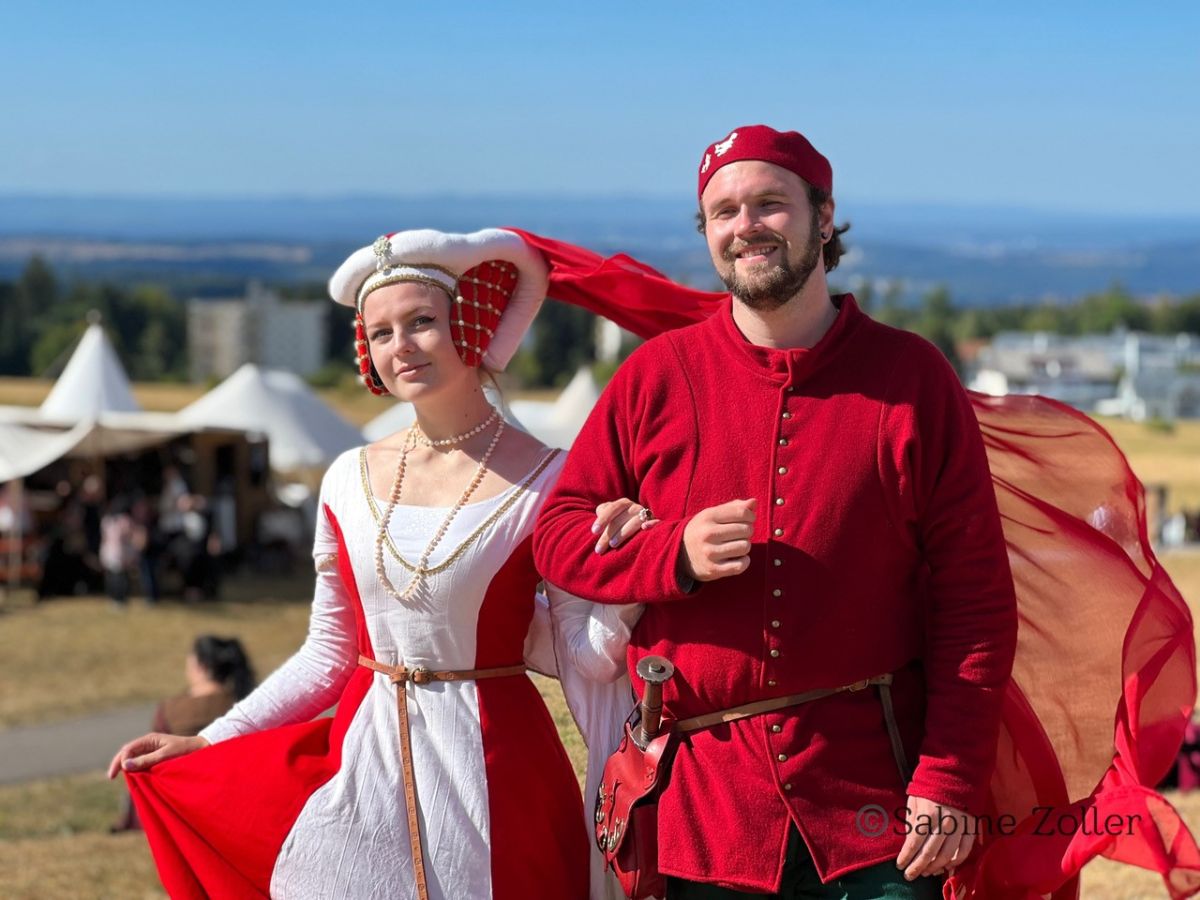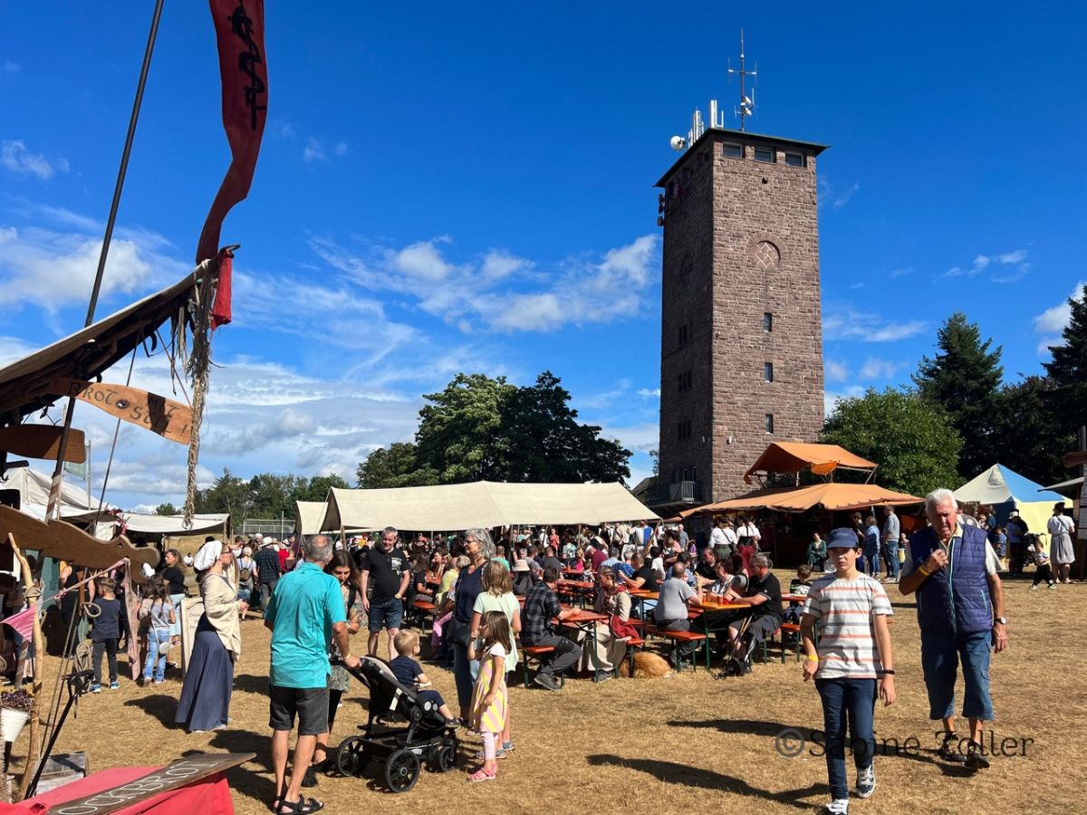 „Hier ist alles Natur“, freut sich Stefan Kling vom Dobel, der das Fest mit seiner Tochter Lina besucht und sich nach zwei Jahren Corona-Pause auf das mittelalterliche Treiben der bunt gemischten Gruppen freut. Für das Lagerleben waren erneut die „Satzveyaner“ aus Pfronten im Allgäu und die Tomburg Riitter aus Worersdorf bei Bonn angereist, um die grandiose Aussicht ins Rheintal bei einem entschleunigten Wochenende zu erleben. „Unsere Gruppe ist insgesamt mit elf Zelten vertreten“, berichtet Volker Reutier aus Pfronten, der alias „Marquardt von Schellenberg“ auf das Holzfeuer und die Verpflegung der Gruppe im „Pfundstopf“ achtet. „Das Lagerleben entschleunigt“, berichtet Bernd Trojandt, der eigens aus Sachsen-Anhalt angereist ist, um sich der Gruppe anzuschließen. Insgesamt waren 35 Lagergruppen aus unterschiedlichen Teilen Deutschlands angereist, um je nach Epoche ein Wochenende so zu gestalten und zu leben wie einst. Darunter die Schäfer aus Bretten, die Teckschen Trutzn aus dem Schwabenland oder die Dragonari aus der Region, der Kim Vischer aus Conweiler ebenso wie ihr Vater Eddy angehören und sich Jahr um Jahr auf das Treffen freuen, das für sie zu einer wunderbaren Auszeit ohne Handy zählt.