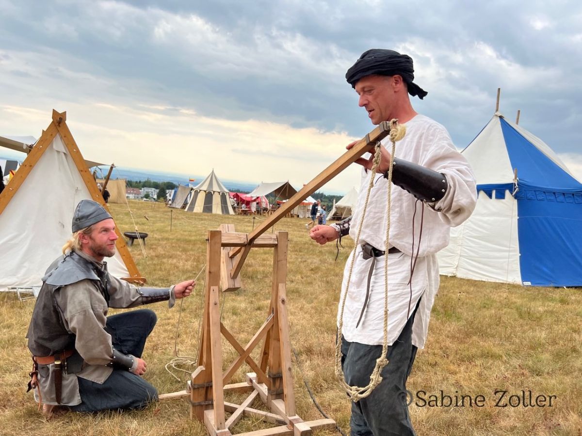 Denn geboten wir alles, was das Herz begehrt. „Sarazenenmaul“ heißt der Döner mit Putenfleisch und „Hexengesöff“ der Apfelsaft mit Calvados. Für Vegetarier gibt es Falaffel oder Fladenbrote und gezahlt wird mit „Talern“. Wer sich gestärkt hat, kann sich dem bunten Treiben widmen und sich bei „Luftikus“ alias Eberhard Nitsche aus Ludwigsburg die Zukunft aus der Kristallkugel vorhersagen lassen, bei den Handwerkern wie Seiler, Lederer und Steinmetze bei der Arbeit zuschauen, oder die Gravuren bei Karl-Heinz Fleck bestaunen. Zur musikalischen Umrahmung sind „Ryanmar der Fidler“ aus Fellbach und „Petrus Fortunatus“ aus Trier angereist und begeistern den fünfjährigen Ben aus Schöllbronn, der selbst Gitarre spielt. „Unser Junge ist von den Rittern und Gauklern begeistert“, verrät sein Vater Hans-Jürgen Weber, der das „gigantische Lager mit der tollen Atmosphäre und den eindrucksvollen Schwertkämpfen“ lobt. Zum Schlendern, Schauen und Kaufen werden nicht nur Mitmachangebote für Kinder angeboten, sondern zudem originalgetreu nachgearbeitete Belagerungswaffen gezeigt. „Das ist ein Trebouchet, ein Katapult-Modell aus Holz und Seilen gefertigt, das bei Belagerungen zum Beschuss von Burgen eingesetzt wurde“, erläutert Frank Stühle aus Schwäbisch Gmünd.