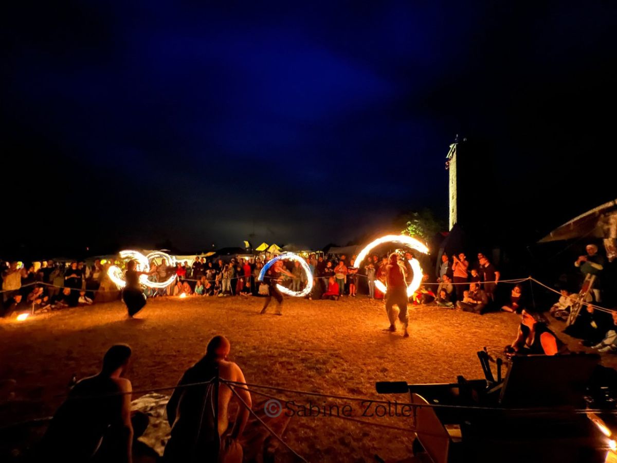 Bei Einbruch der Dämmerung lockte die eindrucksvolle Feuershow der „Plattenwald Barbaren“ die unter Trommelklängen mit Feuer und rhythmischem Tanz viel Beifall erhielten