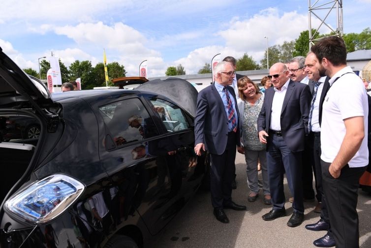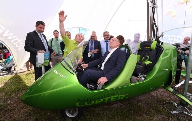 eim anschließenden Rundgang gemeinsam mit Persönlichkeiten des öffentlichen Lebens führte der Minister mit zahlreichen Ausstellern intensive Gespräche. Der Ressortchef für Verkehr ließ es sich nicht nehmen, probeweise auf einem Pedelec „Made in Schwaben“ selbst in die Pedale zu treten. Ebenso beeindruckt zeigte er sich von einem E-Auto neuester Generation sowie den kleinen Tragschraubern, mit denen man über den Schwarzwald kreisen kann.