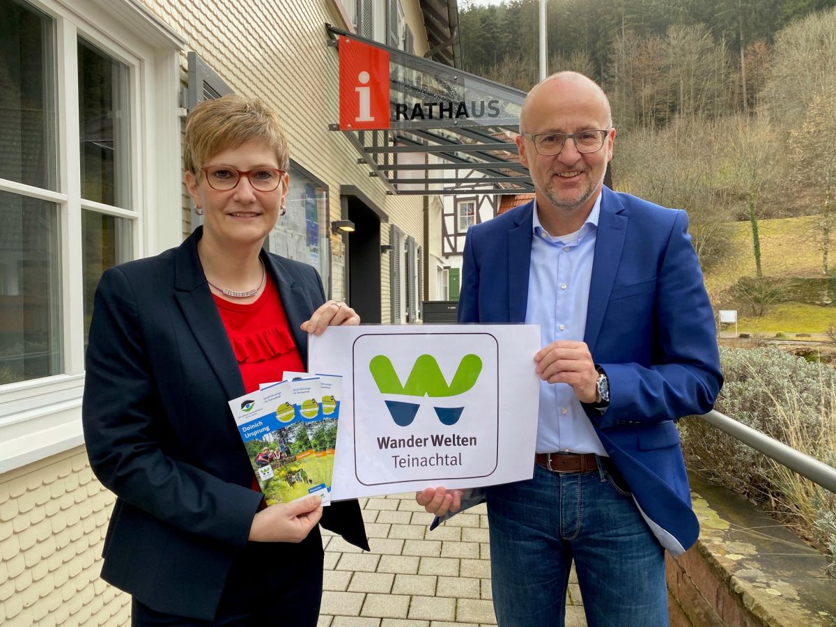 Franziska Bürkle - Teinachtal Touristik und Bürgermeister Markus Wendel präsentieren das Logo der neuen Dachmarke "WanderWelten Teinachtal“