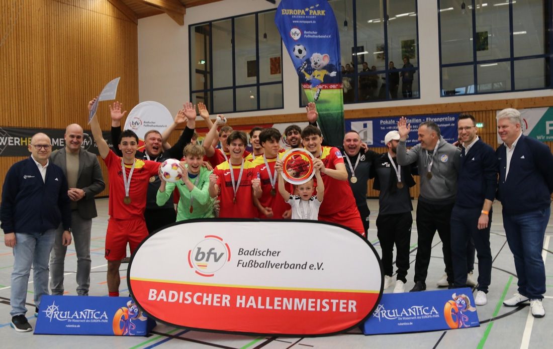 Bei der Siegerehrung, die Rouven Ettner gemeinsam mit seinem Stellvertreter Jörg Barthelmes, bfv-Vizepräsident Spielbetrieb Rüdiger Heiß, Verbandsjugendspielleiter Siggi Bartussek, Heidelbergs Kreisjugendleiter Ethem Ebrem und Dossenheims Bürgermeister David Faulhaber durchführte, freuten sich die Drittplatzierten der JSG St. Leon-Rot über einen Reisekostenzuschuss in Höhe von 500 Euro für ein internationales Turnier von KOMM MIT, die Vizemeister aus Schwetzingen über einen solchen Gutschein in Höhe von 750 Euro. Die neuen Badischen Meister aus der Goldstadt reckten nicht nur unter großem Jubel die Meisterschale in die Höhe, sondern freuten sich zusätzlich über Tickets für den Europa-Park und die Qualifikation für die Süddeutsche Futsal-Meisterschaft am 7. März in Ehningen (wfv), bei der sie die badischen Farben vertreten werden.