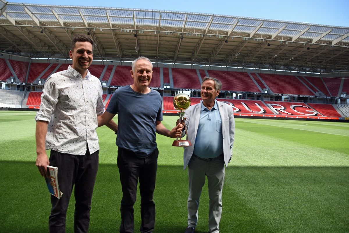 Pokal-Übergabe im Stadion des SC Freiburg: kicker-Redakteur Carsten Schröter-Lorenz, Christian Streich und kicker-Chefredakteur Rainer Franzke