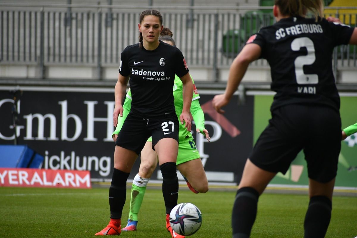 Für den SC traf Hasret Kayikci (79.). Am 15. Spieltag der FLYERALARM Frauen-Bundesliga konnten die SC-Frauen keine Punkte aus Wolfsburg mitnehmen. Vor 900 Zuschauerinnen und Zuschauern endete die Partie bei den Wölfinnen mit einer klaren 1:4-Niederlage. „Wolfsburg hatte schon in der ersten Halbzeit Möglichkeiten, die sie nicht zu Ende spielen. Wir allerdings auch – wir haben uns im Verlauf des ersten Durchgangs gut gesteigert“, sagte SC-Coach Daniel Kraus nach der Partie. Das Team des Freiburger Trainers startete im 5-3-2: Vor Rafaela Borggräfe verteidigten Lisa Karl, Greta Stegemann, Janina Minge, Samantha Steuerwald und Marie Müller. Das Mittelfeld bildeten Meret Wittje, Mia Büchele und Hasret Kayikci. In vorderster Linie stürmten Ereleta Memeti und Giovanna Hoffmann, die nach langer Zeit ihr Pflichtspiel-Comeback gab. Unter dem Motto #stopwar hielten die beiden Mannschaften und die Fans auf den Tribünen vor Spielbeginn eine Gedenkminute anlässlich der aktuellen Ereignisse in Europa. Der Sport-Club begann in der Folge drückend und erspielte sich in den Anfangsminuten gleich die ersten Chancen: Lisa Karl und Marie Müller kamen zum Abschluss (4.), beide Chancen waren jedoch zu ungefährlich für Almuth Schult im Wolfsburger Tor. Auch der VfL setzte schnell das erste Ausrufezeichen: Tabea Waßmuths Schuss aus der Distanz landete nur knapp über dem Gehäuse von SC-Keeperin Rafaela Borggräfe (7.). Schnell wurde deutlich, wer das Spiel im AOK Stadion bestimmen sollte: Wolfsburg übte mehr und mehr Druck auf die Freiburgerinnen aus und kam zum Torerfolg: Nach Handspiel von Meret Wittje entschied Schiedsrichterin Laura Duske auf Elfmeter, Dominique Janssen verwandelte sicher im rechten unteren Toreck zum 1:0 für den VfL (15.). Wolfsburg bestimmte anschließend das Spiel und übte viel Druck auf den Sport-Club aus. Immer wieder konnte der SC sich mit langen Bällen befreien, die eigenen Angriffe aber nicht konsequent 2 zu Ende spielen.