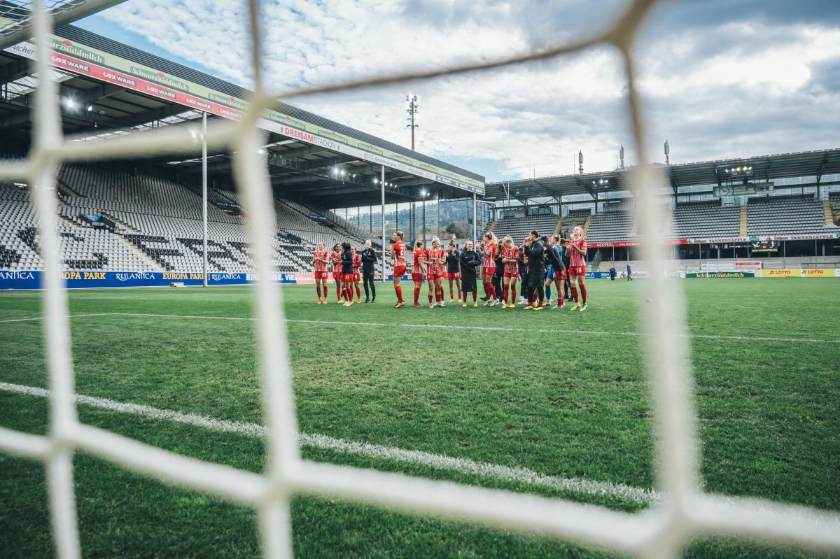 Die Partie wurde nun mehr und mehr von den Freiburgerinnen an sich gerissen. Dem Team von Theresa Merk gelang es, sich mehrere vielversprechende Abschlüsse herauszuspielen. Im Interview mit Sky nach dem Spiel sagte die Trainerin: „Ich fand uns im Spiel insgesamt schon spielbestimmend und auch über weite Strecken die bessere Mannschaft.“ Einmal von der rechten Seite versuchte es Judith Steinert, wenig später dann Marie Müller von links. Müllers Schuss aus spitzem Winkel prallte auf dem Weg zum Tor jedoch ab von Kapitänin Johanna Kaiser. Kurz vor der Pause dann die ganz dicke Chance zur Führung: Eine abermals akkurat getretene Ecke von Kayikci landete auf dem Kopf von Janina Minge. Auch hier konnte das Leder vor der Linie in letzter Sekunde geblockt werden, kullerte aber zurück an die Strafraumgrenze, wo Meret Felde nicht lange fackelte und einen flachen Schuss Richtung RB-Kasten abfeuerte. Diesmal bewahrte der Pfosten die Gastgeberinnen vor dem Rückstand. Zum Ende des ersten Durchgangs blieb zu bilanzieren, dass die SC-Frauen dank sichtbaren Vorteilen durchaus eine Führung verdient hätten. Beim Pausenpfiff von Karoline Wacker stand jedoch auf beiden Seiten noch die Null.