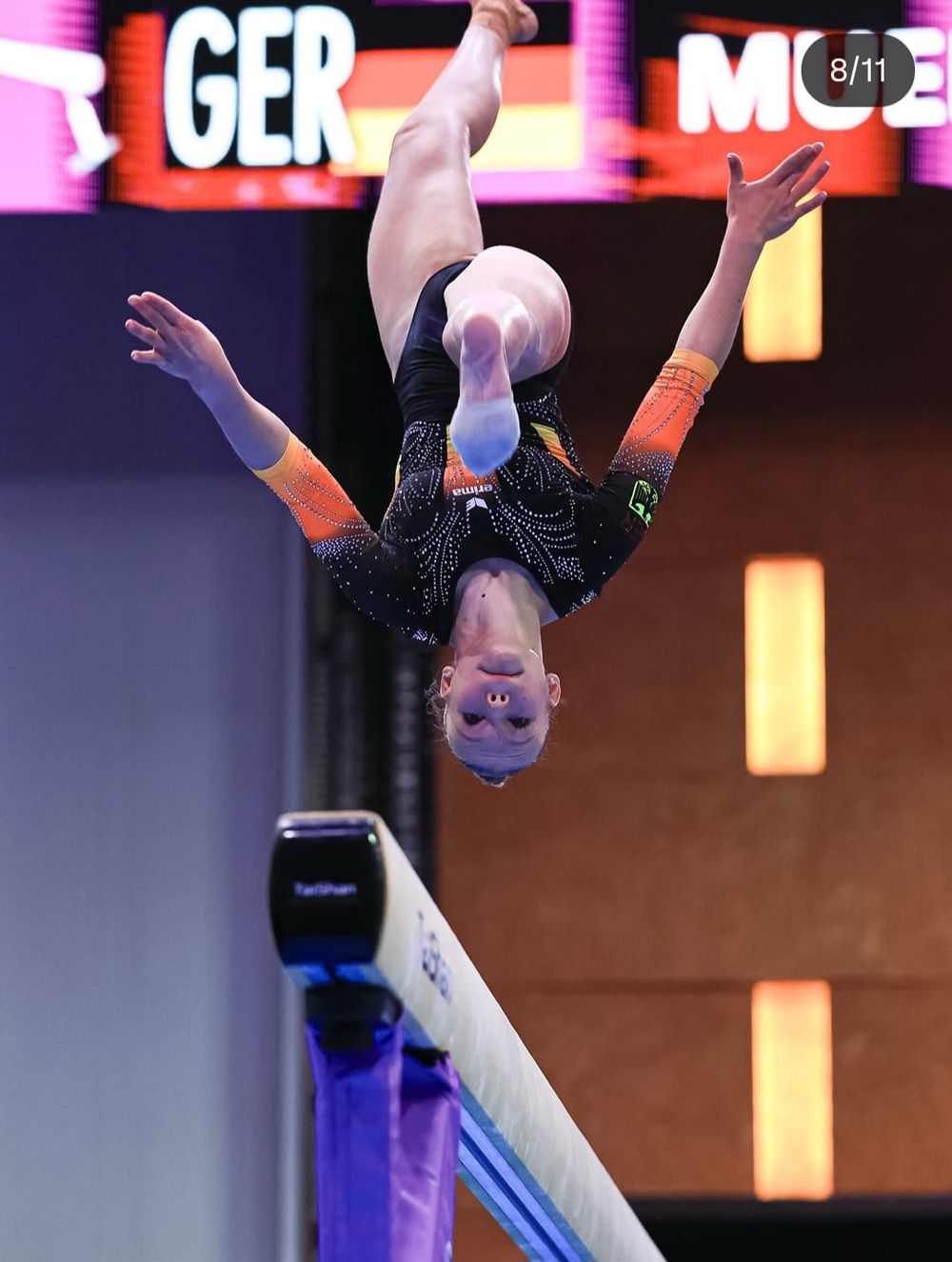 Fokussieren auf den Schwebebalken war nun die Devise. Ebba die als dritte des Trios ans Gerät ging, zeigte große Nervenstärke. Obwohl sie fast 10 Min. auf die grüne Fahne und somit das Go des Kampfgerichtes warten musste, zeigte sie eine tolle Balkenübung. Auch am Boden überzeugte sie die Kampfrichter mit ihrer akrobatischen und tänzerischen Vorstellung. An beiden Geräten erhielt sie mit 11,533 P. und 12,1 P. jeweils die höchste Wertung des Deutschen Teams.