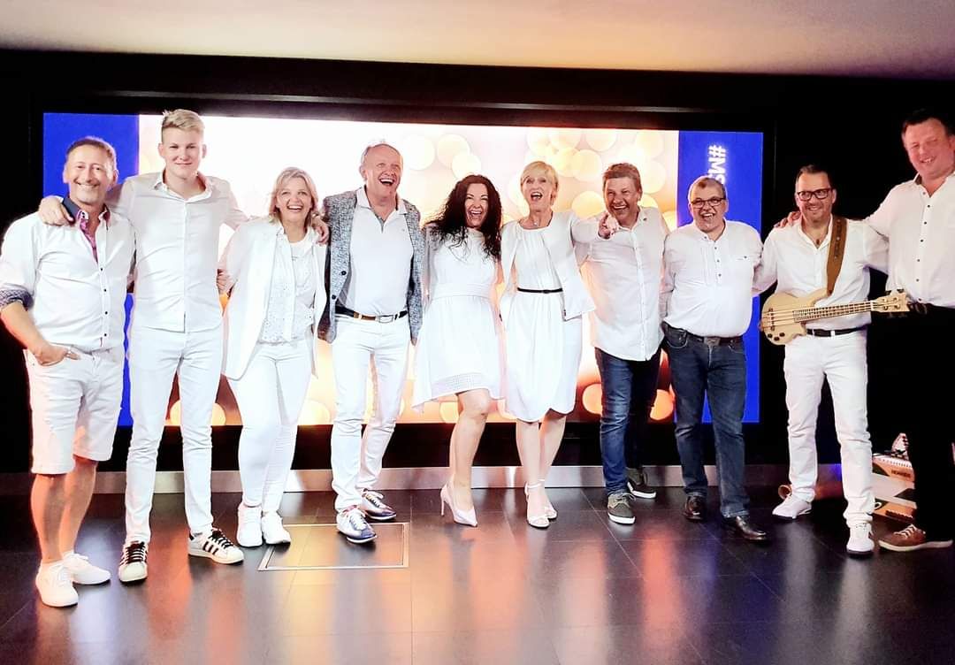 Die Künstler gemeinsam mit dem Veranstalter zum Abschluss der weißen Nacht auf hoher See Joe Kuttruff, Robin Leon, Nadin Meypo, Lothar Böhler, Daniela Martinez, Fan, Geri der Klostertaler, Ralf Tritschler, Joachim Schuler, Martin Hummel